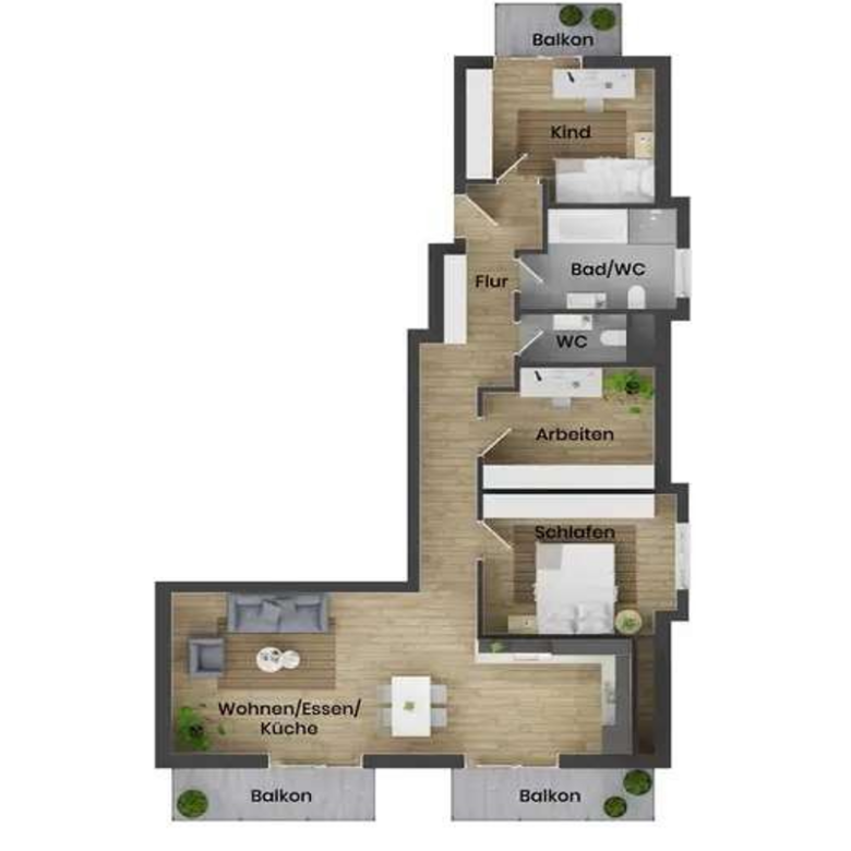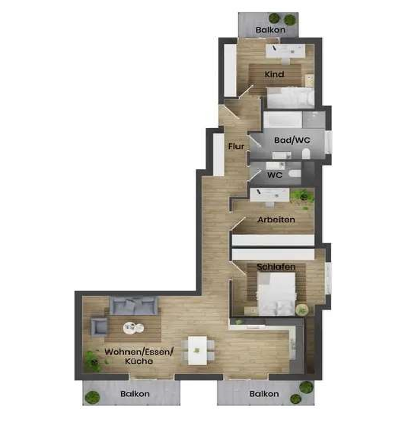 Der großzügige Wohn- und Essbereich bildet das Herzstück der Wohnung. Große, bodentiefe Fenster sorgen für viel Tageslicht und eine freundliche, offene Atmosphäre. Hier entsteht ein lebendiger Mittelpunkt für gemeinsame Mahlzeiten, Spielenachmittage oder entspannte Abende im Kreis der Familie. Von hier aus gelangen Sie auf eine der drei Terrassen, die zusätzliche Freiräume unter freiem Himmel schaffen und vielseitig nutzbar sind.
