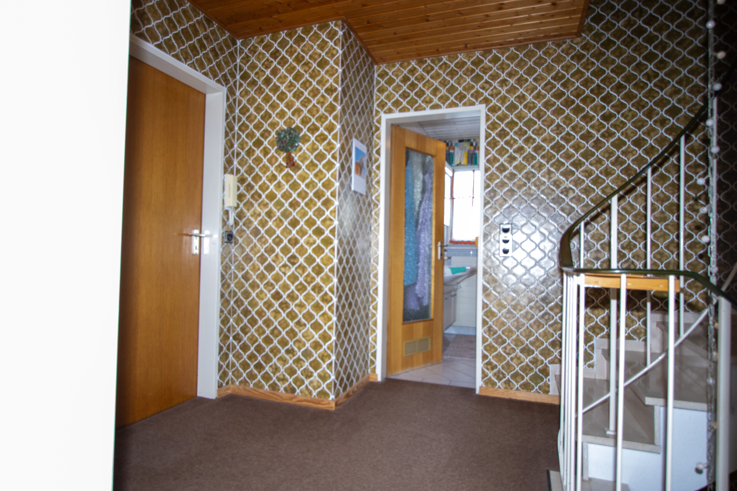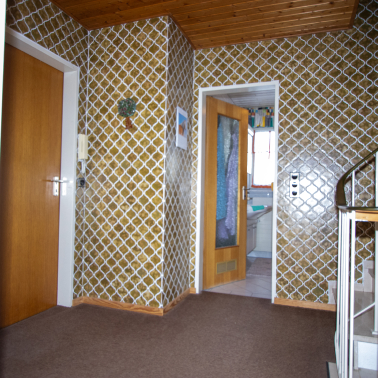 Zur Ausstattung zählen geflieste Treppenhäuser, Teppich- und Fliesenböden sowie Parkett im Wohnzimmer. Eine Einzelgarage mit überdachtem Freisitz rundet das Angebot ab.